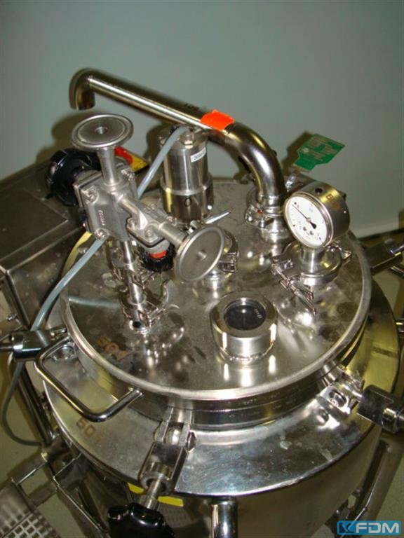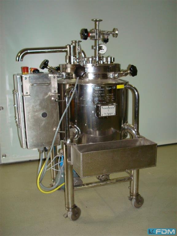 Double jacketed reaction and stirring vessel, volume 30 l., pressure range -1/+3 bar, temperature range -10/150 °C, externally heated, double jacket volume 4 l., pressure -1/+3 bar, temperature range -10/+150 °C, product touching parts made out of s/s 1.4571 (AISI 316 Ti), others 1.4301 (AISI 304), inspection window, lighting, various connections, eccentrically mounted magnetic stirrer 0.37kW, speed adjustable 0 - 201 rpm, agitator diam. 120 mm, 3 stirring blades, 6 pressure latches, torospherical (dished) bottom, discharge valve at the bottom, mobile, temperature sensor double PT-100, Siemens Micro Master frequency converter, Siemens OPM Clear Text display, el. connection 230V/50Hz/1kW